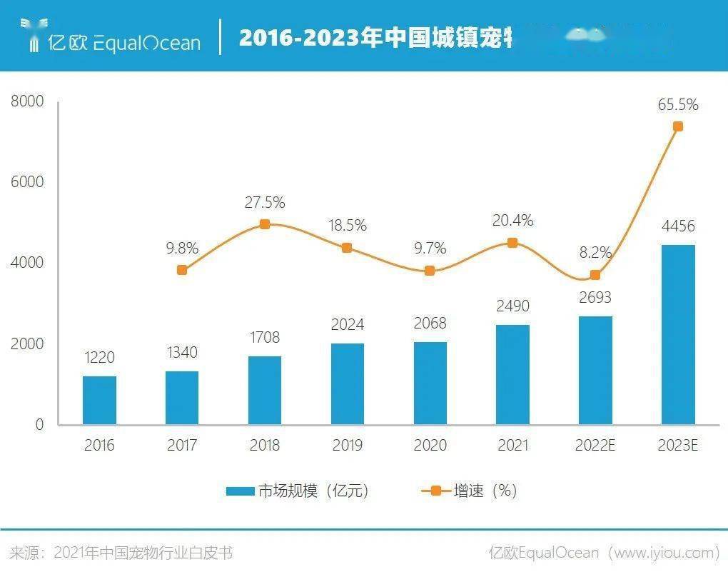 中国畜牧业宠物产业分会指导的《2021年中国宠物行业白皮书》显示,中国城镇家庭宠物猫的数量为5806万只、宠物犬的数量为5429万只,合计超过1.1亿只;2021年全国城镇宠物消费市场规模达到2490亿元,预计到2023年将进一步增长至4456亿元。