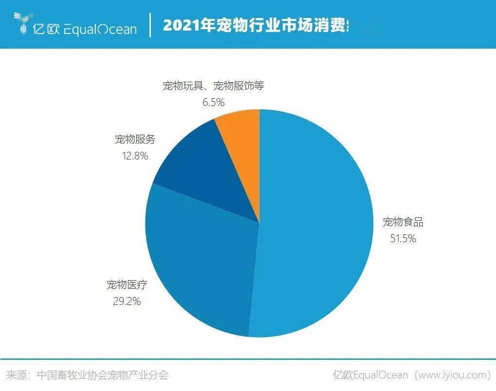 中国畜牧业协会宠物产业分会数据显示,2021年宠物行业市场消费结构中,宠物食品产业占市场的51.5%,宠物医疗产业占市场的29.2%,服务产业包括宠物寄养、宠物美容、宠物婚丧等占据市场的12.8%,另外还有宠物玩具、宠物服饰等领域占据6.5%。