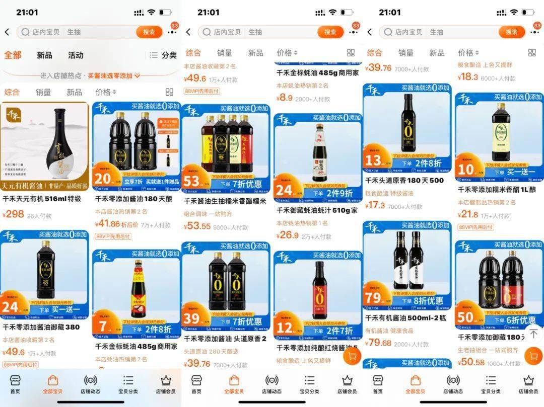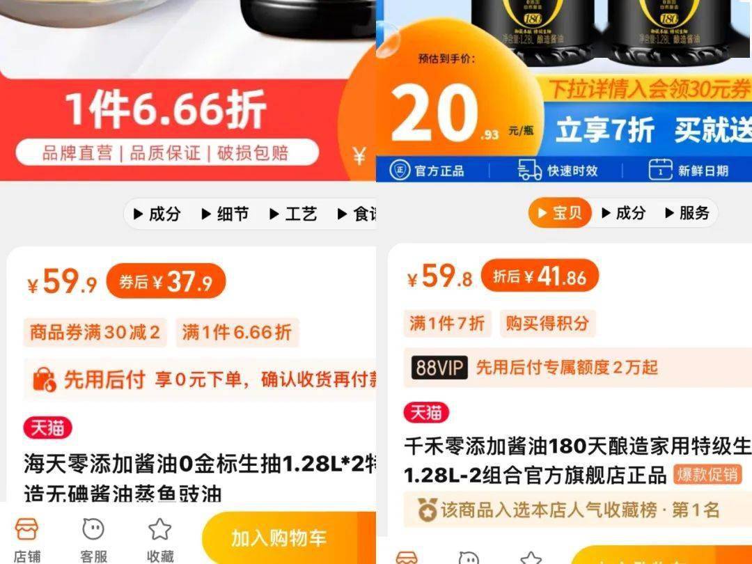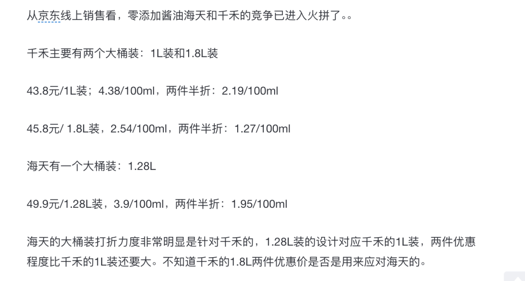 经过剁主多番搜索,发现在2021年双方有过一番“血拼”。海天用每3.9元/100ml的0添加酱油对阵千禾4.38元/100ml的0添加酱油,而千禾则在“打包价”性价比上又优于海天,双方在小数点后两位的你来我往,着实是火花四射。