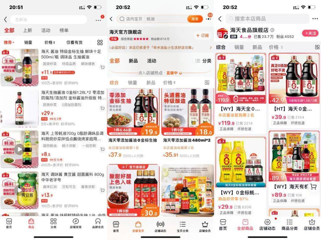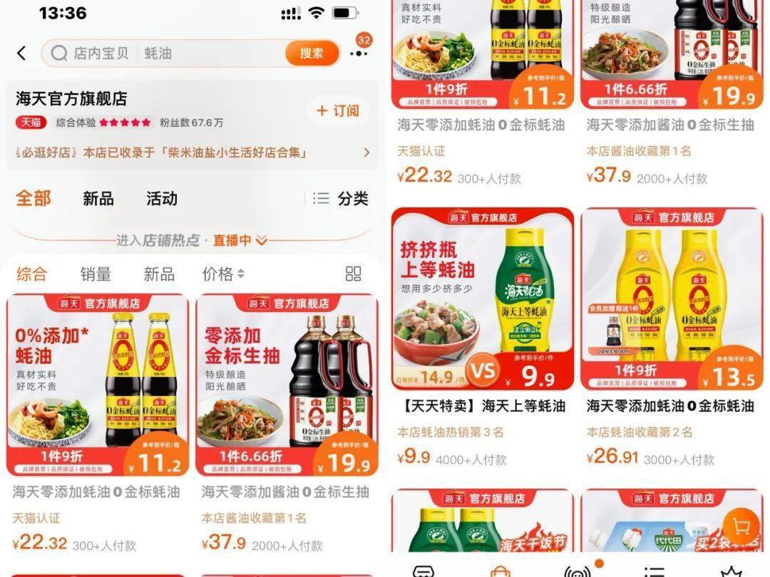 海天味业也深谙这一中国人的消费习惯,线上线下采用了不同的产品策略——线下以传统产品为主,靠低价占领超市、小卖部;在线上各个平台,海天自主运营的店铺中,占绝大部分版面的,都是“0添加”系列。