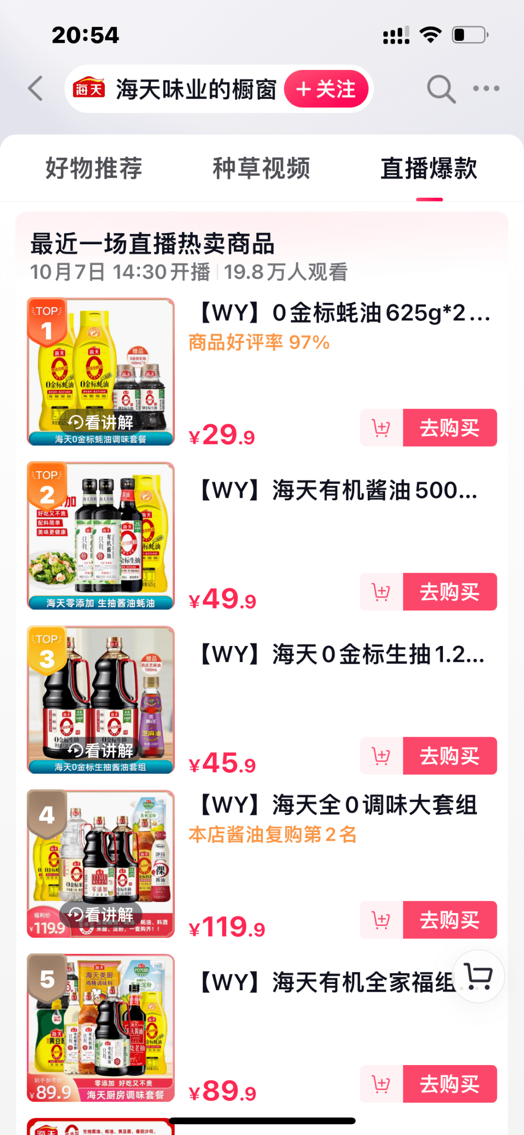 或由于其抖音被迫停播,剁主只能查看到过去的销量数据。在海天抖音店铺销量前5名中,有4款是0添加系列,包括0金标生抽1.28L*2、全0调味大套组、有机全家福组合和0添加调味套餐——当然,这也很可能是因为,海天其他的货品也没怎么上架抖音。